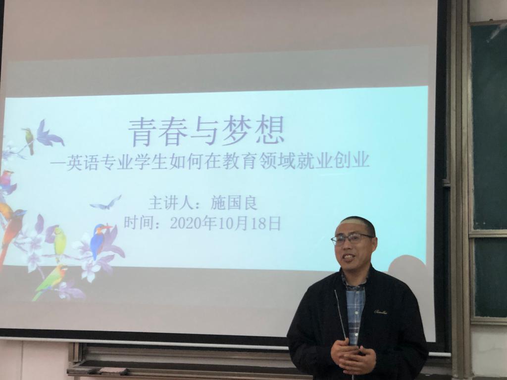 施国良校友在讲座中分享了他求学以及毕业后走上教师岗位的人生经历,鼓励同学们尤其是立志于从事教师行业的同学们在大学期间要把专业课学精、学透,学会思考,做好学业生涯规划,为将来从事教育事业打下坚实的基础。同时,他还介绍了他目前正在负责的一个大型创业项目“寻找单词王”,希望英语专业的同学们利用自身的专业优势,积极参与到该项目中来,在提升个人素质的同时不断丰富专业实践经验,为将来在教育领域就业和创业做好充分的准备。