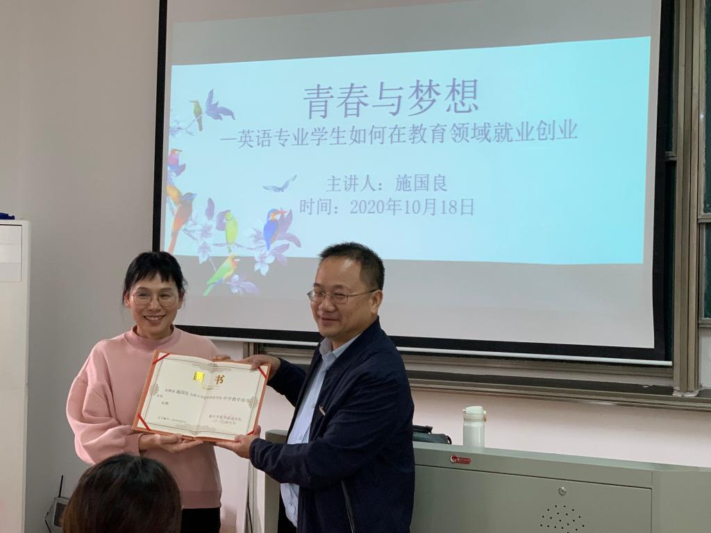 副院长喻锋平首先向在座的同学们介绍了主讲嘉宾——英语86级校友、嘉兴市秀洲中学高级教师施国良老师。之后,党委书记陶丹玉代表学院向施老师颁发了中学英语教学指导教师聘书。