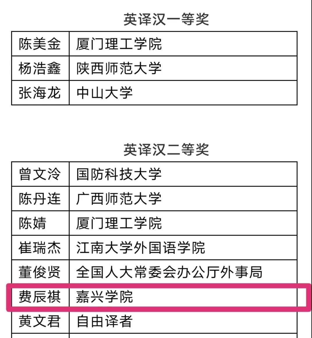 “整个翻译过程非常艰辛,就像是戴着镣铐跳舞,因为既要保证原文意义的准确表达,又要进行高难度的创作。为此,我先通读原文,后查阅生词、俚语,分析句式,还到嘉兴市图书馆找来了文中提到的相关作品,在对作品充分理解的基础上不断推敲、反复打磨,最终形成了比较满意的参赛译文。”谈到这次获奖,费辰祺脸上洋溢着自信的微笑。她说:“通过参加这次比赛,我也收获了很多,学会了如何在实践中充实和磨炼自己。希望英语专业的同学们时刻保持对语言的热爱,把握每一次机会,精心浇灌,静待花开。”