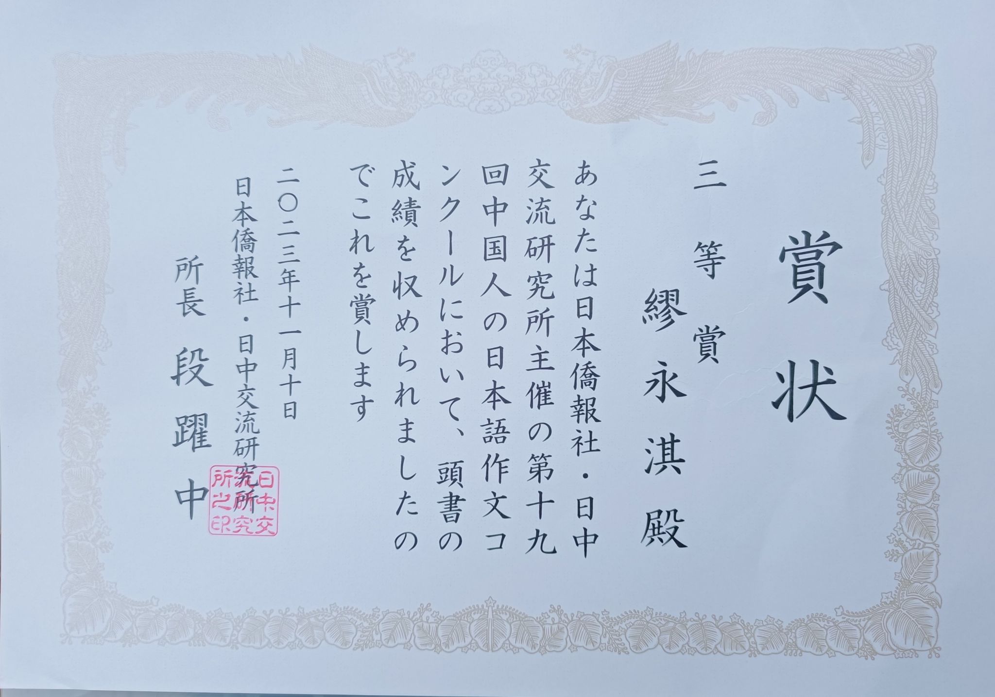 近日,由日本侨报社和日中交流研究所共同举办的“第19届全中国日语作文大赛”评选结果最终揭晓,我校日语专业2020级缪永琪同学的日语作文“過去に鑑みて中日平和を孕む”(中文题目“以史为鉴 共育中日和平”)荣获三等奖。