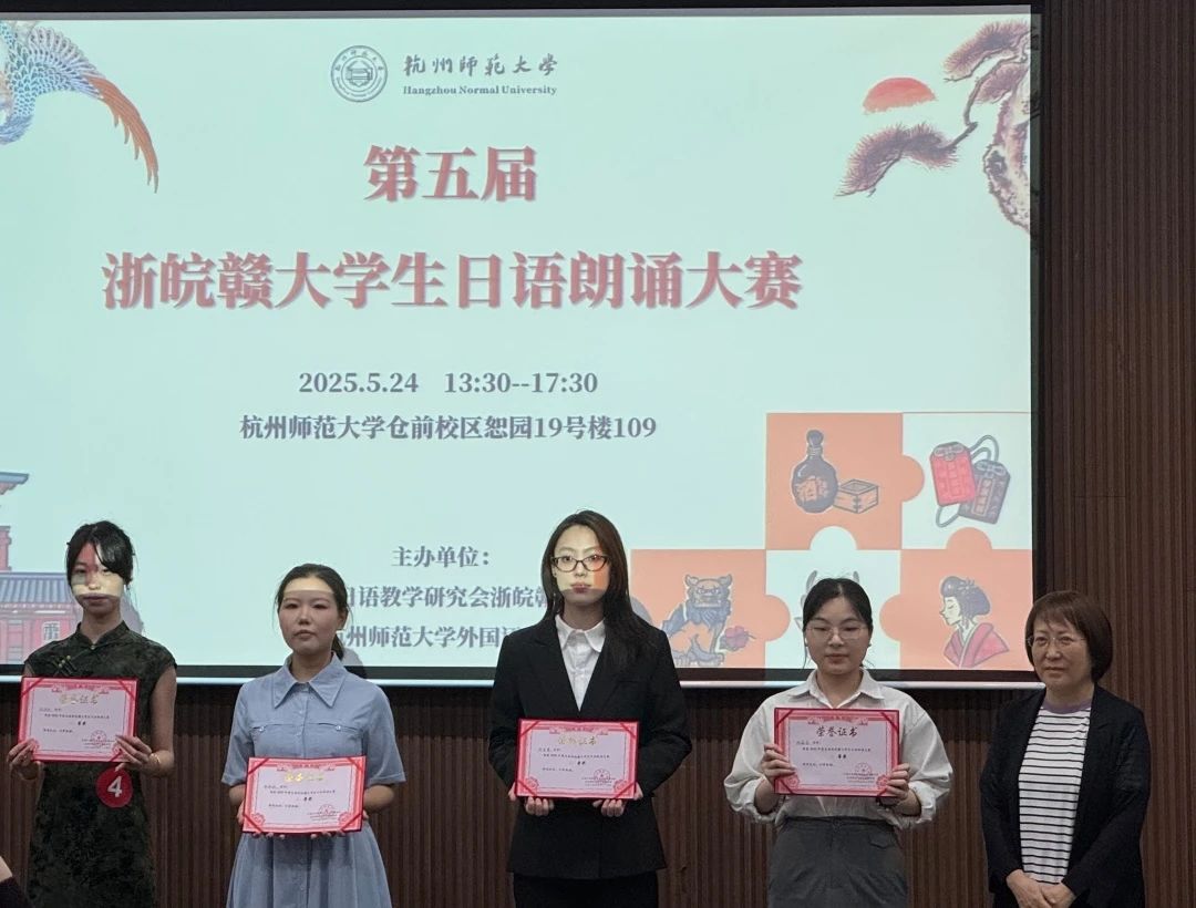 5月24日,第五届浙皖赣日语朗诵大赛在杭州师范大学成功举办。本次大赛吸引了来自浙皖赣三省十七所高校的优秀选手同台竞技,我院日语专业杨晶晶同学凭借对森鸥外名作《高濑舟》的精彩演绎,以第三名的优异成绩荣获大赛二等奖。