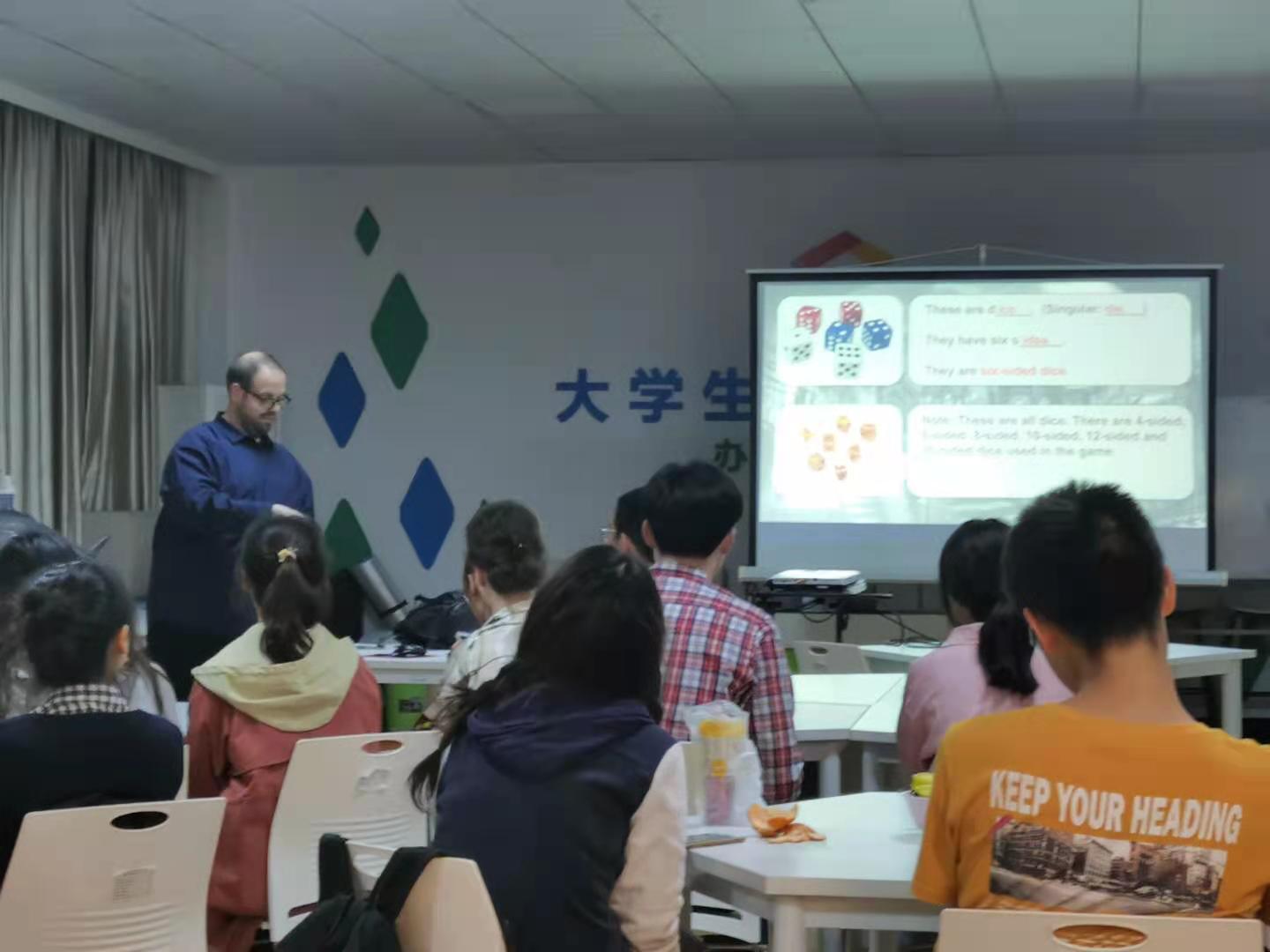4月22日晚18:30,由beat365在线唯一官网主办的本学期第二次外教沙龙活动于北区创业园一楼展厅顺利开展。本次活动主题为“Dungeons & Dragons:the history,the culture ,and the experience of the world's most famous table-top role playing game(龙与地下城:世界上最著名桌面角色扮演游戏的前世今生)”。以游戏这一大家感兴趣的话题入手,同学们在潜移默化中锻炼了英语口语,增长了西方文化知识。