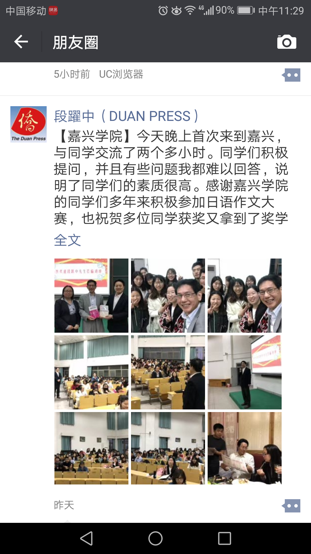 以“面向主流社会,服务中日交流”为宗旨,段先生先后创立了在日中国人文献资料中心、创办了《日本侨报》及日本侨报出版社、日中交流研究所、NPO法人日中交流支援机构等,宣传报道中国,力促中日友好。尤其是段先生力推举办的“中国人日语作文大赛”,迄今已十三届,每年有全国数百所高校共近四千多篇日语作文参赛,是我国迄今为止规模最大、规格最高的一个专业日语教学水平的国家级大赛。在获奖概率仅为2%的激烈竞赛中,近三年,我院日语专业5位同学荣获三等奖,10名同学获佳作奖,三次获得“优秀指导教师奖”。特别是其中的金梦莹和朱杭珈两位同学分获480万日元赴日留学奖学金,为浙江省唯一获得此项高额奖学金的高校。我院日语专业的教学得到了段先生的首肯,这也是促成段先生此行的一个重要契机。