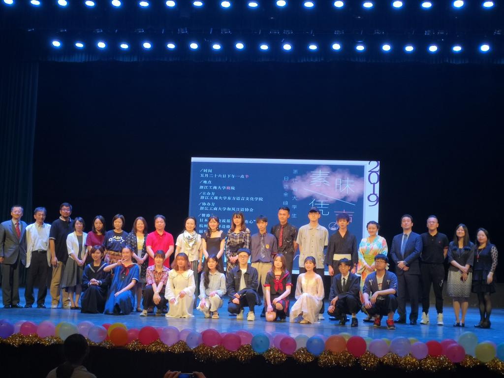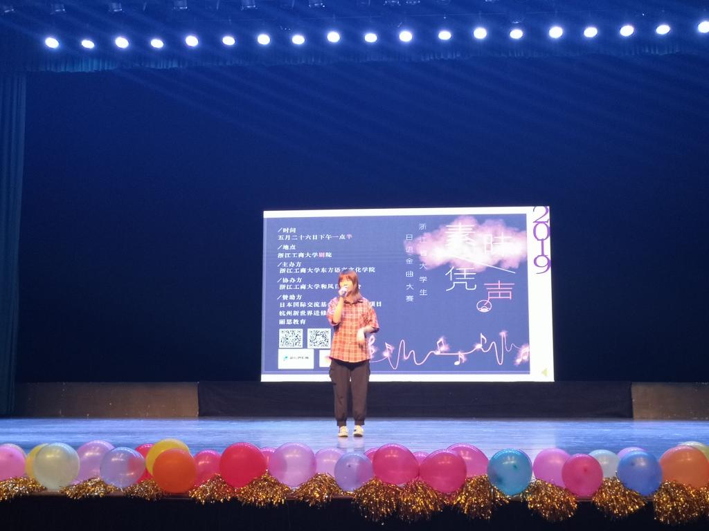 浙江省日语金曲大赛已成功举办七届,大赛由浙江工商大学主办、卡西欧中国有限公司赞助,是浙江省内设置日语专业各高校竞相展示自己学生日语发音和日语应用能力的一项大赛,规模较大,影响不菲。此次比赛分为两轮角逐。首轮比赛中,唐怡清同学的一曲经典民谣『涙そうそう』,韵味十足,凄婉动人,感动了评委,由此进入第二轮决赛。在第二轮的决赛中,她演唱的是一首日文抒情歌曲——『僕が死のうと思ったのは』。唐怡清同学吐字清晰,音准拿捏恰当,歌声给人勇气和希望,博得了全场阵阵热烈的掌声。最终,唐怡清同学获三等奖,与浙江工商大学、浙江工业大学和浙江师范大学等获奖的6所高校的同学并肩站在了领奖台上。