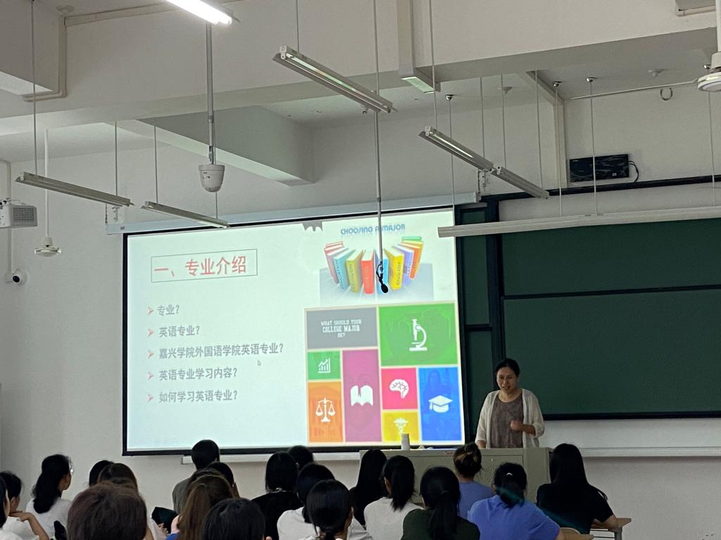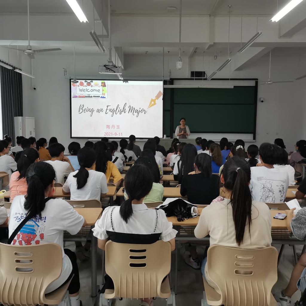 9月11日上午,新生入校始业教育的第二天,beat365在线唯一官网英语专业负责人陶丹玉教授以“Being an English Major”为题在兴德南楼203教室为全体英语专业2021级新同学上了第一堂专业入门课。