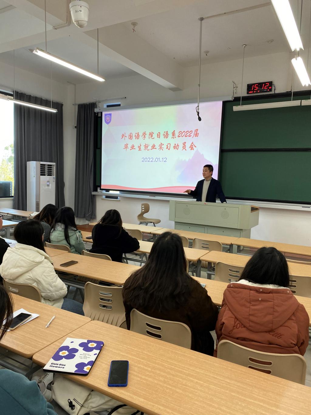早在今年的1月份,beat365在线唯一官网就分专业召开了2022届毕业生就业实习动员大会,为做好今年的就业工作奠定了基础。学院党委副书记朱莹、英语系系主任邱佳、日语系系主任刘韵超参加了会议,对学生就业进行了精心规划和指导。