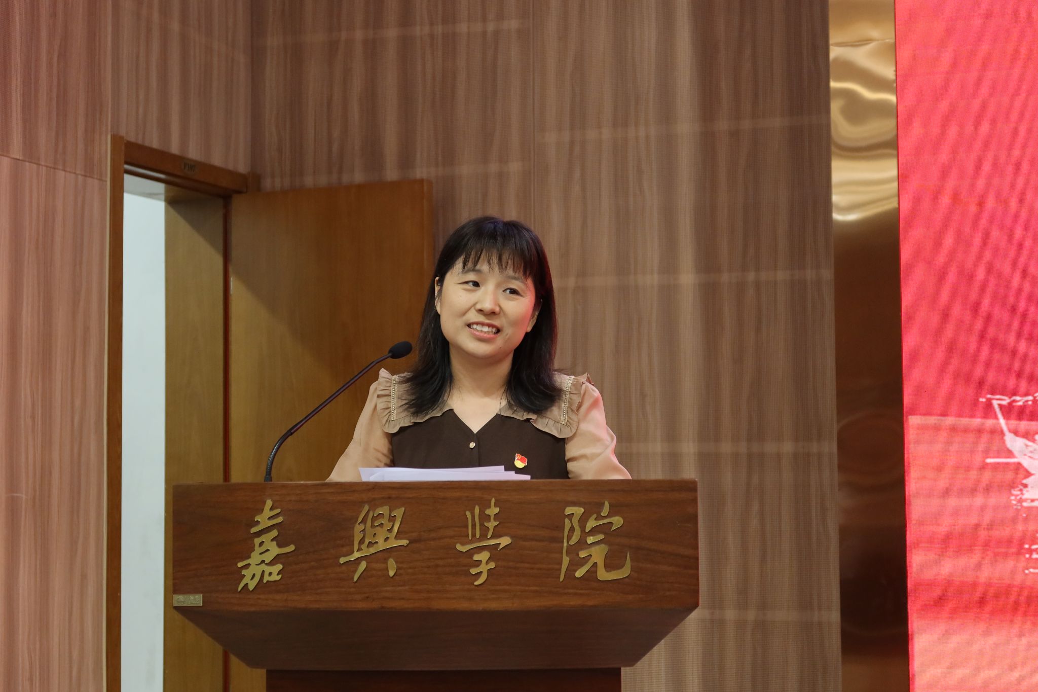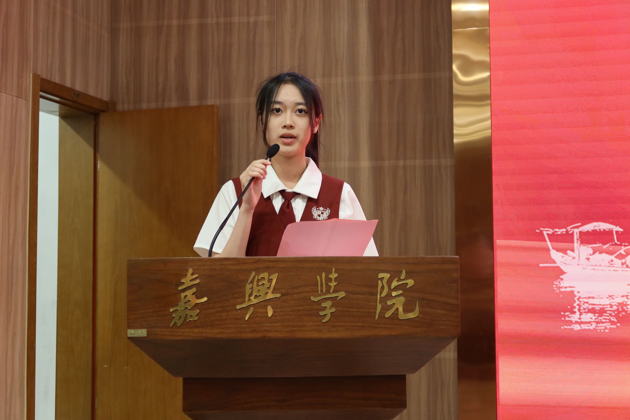 新生代表英语232班林若兮表达了对各位老师和学长学姐的感谢,也表现出对未来大学生活的期待,同时给予自己和全体新生最美好的祝愿:“勿忘初心,坚守自我;提升素养,规范言行;踔厉奋发,执着超越。”