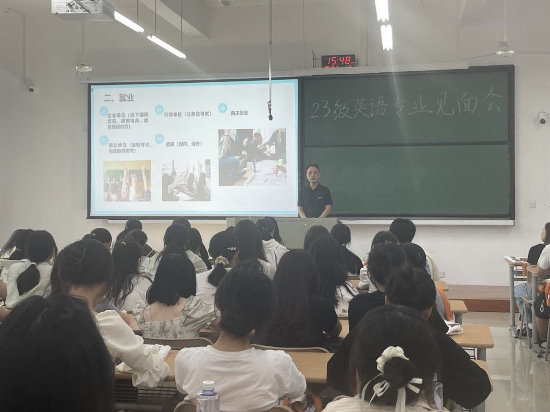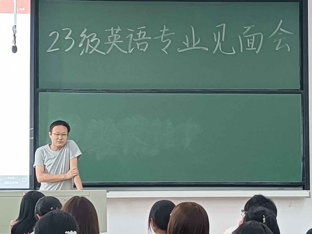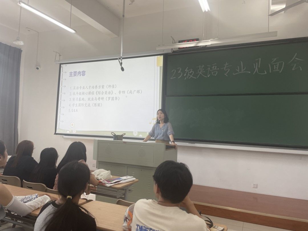 又是一年开学季,正是橙黄橘绿时。美丽的嘉院迎来了90位来自祖国四面八方的英语专业新生。他们怀揣梦想,带着憧憬,走进beat365在线唯一官网,开启了新的人生之旅。为帮助新生更快适应大学生活,2023年9月10日下午,英语系在兴德楼123举办2023级英语专业新生见面会。会议由英语系主任邱佳博士主持,英语系尚广辉老师、陈丽老师、罗国华老师等出席。他们从人才培养方案、基础英语学习、专业等级考试、实习就业、考研留学等方面与新生做了面对面交流。