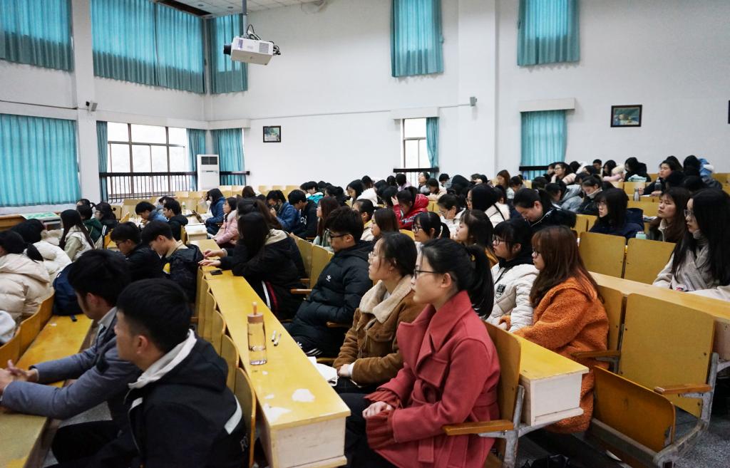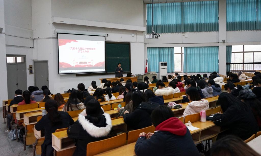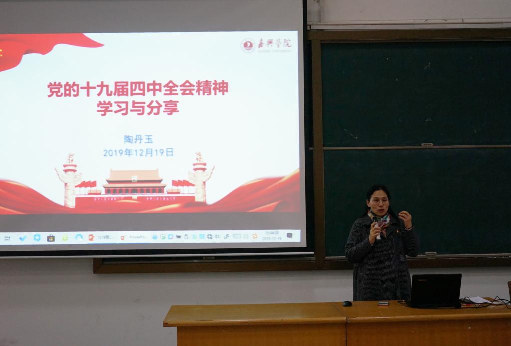 2019年12月19日下午,beat365在线唯一官网在外语楼310进行了一场面对学生的十九届四中全会精神宣讲会。主讲人是学院党委书记陶丹玉,参加听讲的学生包括外院全体学生党员、入党积极分子和各班普通学生代表近200人。