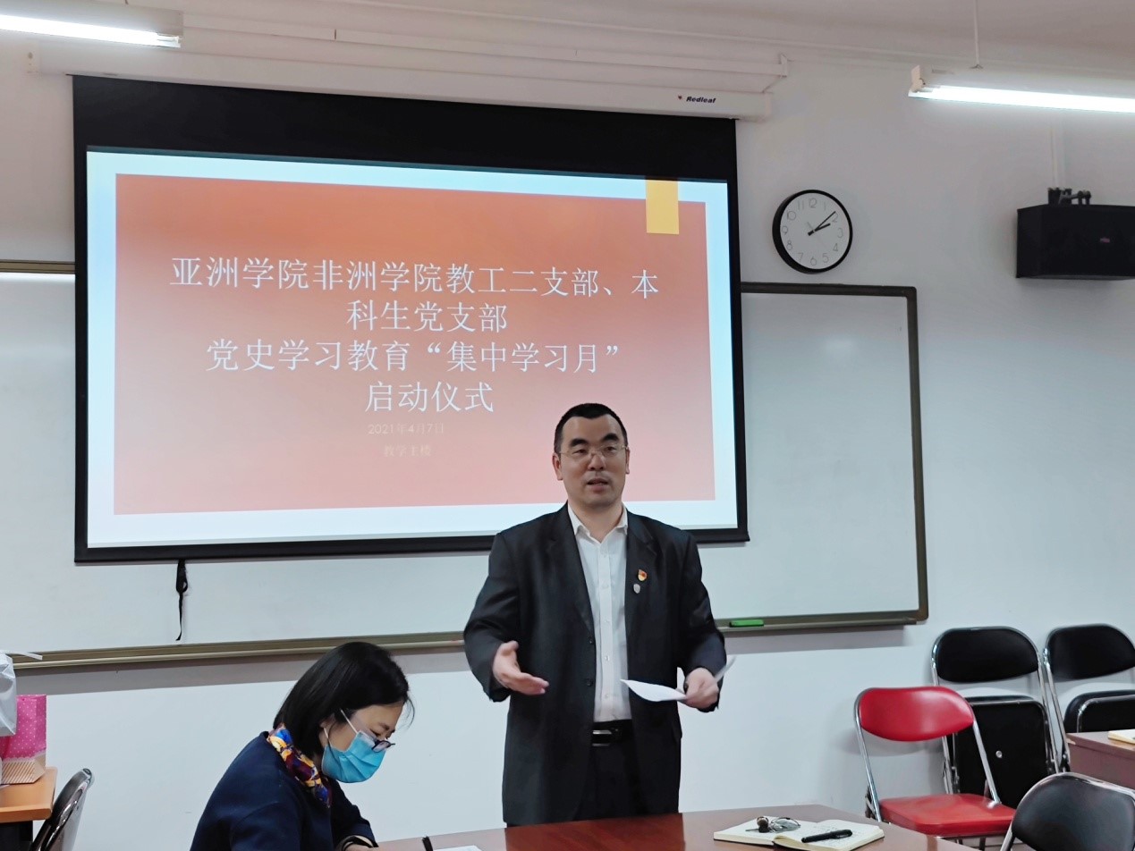 2021年4月7日,beat365英国官网、非洲学院党总支举办党史学习教育“集中学习月”启动仪式暨第一次集中学习活动。党总支书记许晔、非洲学院院长李洪峰、教工二支部及本科生支部三十多名同志参加了主会场活动。教工一支部、研究生党支部在各自的分会场开展学习。