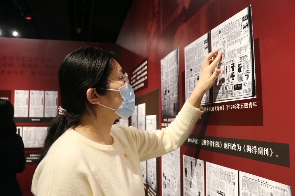 在讲解员的带领下,党员师生们首先参观了“纸上风云五十年——《美洲华侨日报》特展”。展览分为四大板块,分别是“烽火催生”、“世事纵横”、“侨社万象”、“报人风姿”。通过详尽的讲解和丰富的实物展品,党员们了解了在海外华文报刊史上占有重要地位的《美洲华侨日报》的创刊历史,仿佛亲眼见证了华侨们的美洲大陆上的生活发展,真切认识到《美洲华侨日报》在充当华侨华人的喉舌、继承弘扬中华优秀传统文化、增进中美两国人民友好交往等方面所扮演的重要角色。