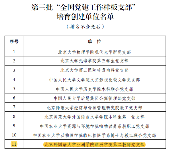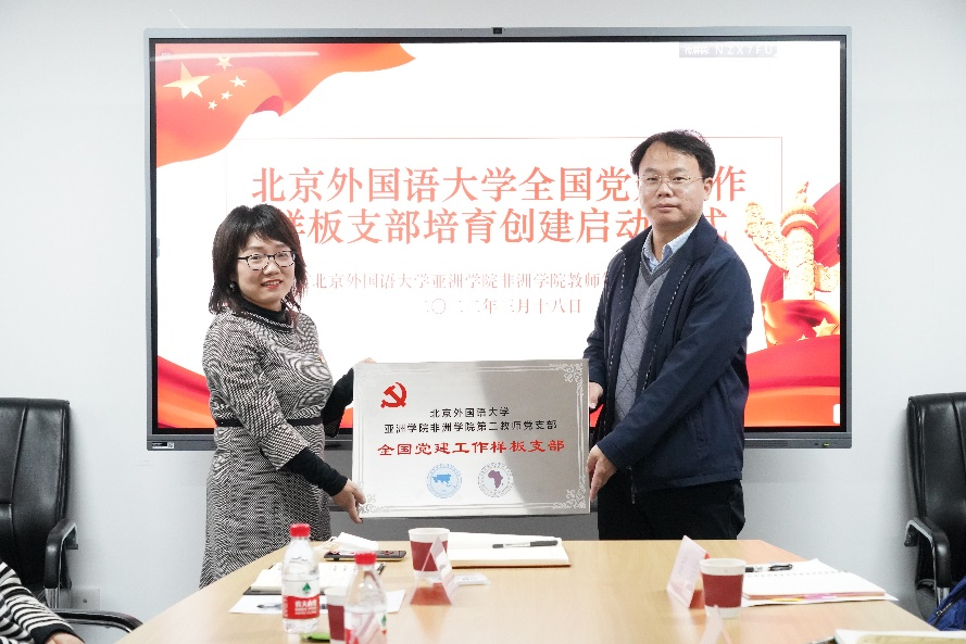 党委宣传部副部长、新闻中心负责人王薇薇宣读了《教育部办公厅关于公布第三批全国党建工作示范高校、标杆院系、样板支部培育创建单位名单的通知》。党委组织部常务副部长冯刚为beat365英国官网非洲学院教师第二党支部授牌,勉励支部党员在党建和学科建设深度融合的道路上继续前进。