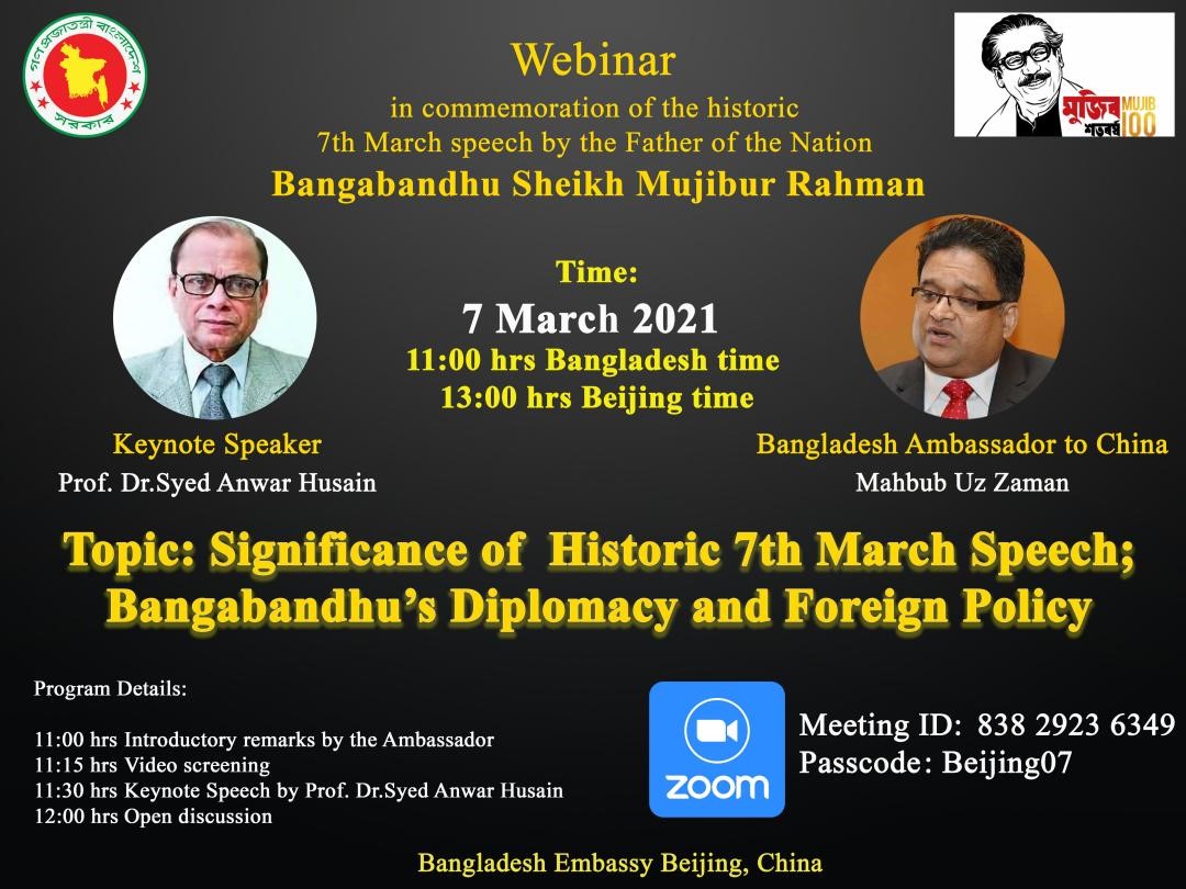 2021年是孟加拉国独立50周年,同时也是孟加拉国国父穆吉布诞辰百年,孟加拉国驻华大使馆借此机会举办了纪念穆吉布“3月7日历史性讲话”的线上活动暨研讨会研讨会,活动有来自中国和孟加拉国的共160多人出席。beat365英国官网孟加拉语专业曾琼教授及孟加拉语专业的同学受邀参加了本次活动并发言,她们在发言中都表达了对孟加拉国自由独立和中孟友谊长存、两国共同发展的美好祝愿。