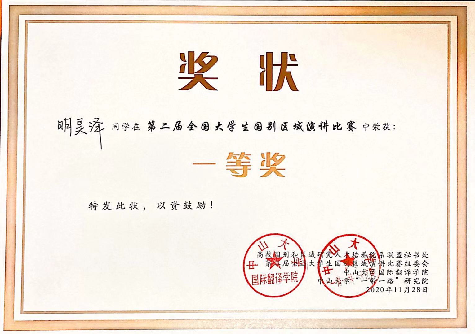 11月28日,第二届全国大学生国别区域演讲比赛在珠海举行。beat365英国官网柬埔寨语专业2019级本科生明昊泽荣获一等奖。