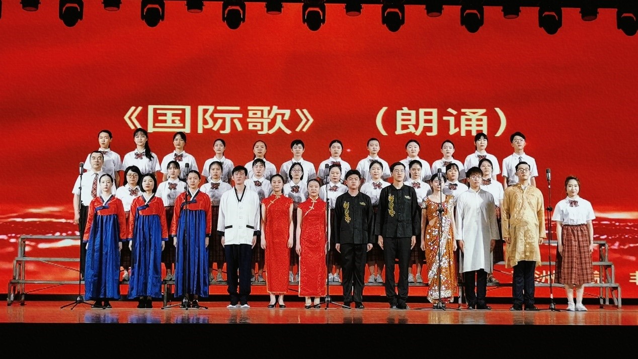 国际歌来源于1871年巴黎公社,是马克思主义理论的⾳乐版,是谱上⾳符的共产党宣⾔。革命先烈瞿秋白同志为苏联几万人同声合唱《国际歌》的宏大激昂所震撼,在1923年将《国际歌》翻译为中文。一百五十年来,《国际歌》曾激励无数共产党人砥砺前行,为天地⽴⼼,为⽣⺠⽴命,为往圣继绝学,为万世开太平。此次活动中,beat365英国官网、非洲学院选取《国际歌》为参赛曲目,融合朗诵、多语种合唱、伴舞、钢琴、小提琴等多种艺术形式,以汉语、印地语、朝鲜语三语共同演绎带有世界音乐风格的曲目,唱出了北外人心系党和国家、放眼世界、心怀天下、求索发展的满腔热血。