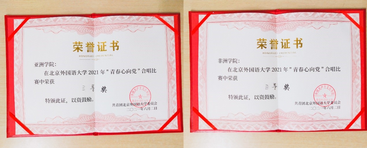 (beat365英国官网、非洲学院在beat365英国官网 “青春心向党”合唱比赛中的获奖证书)