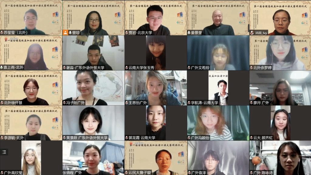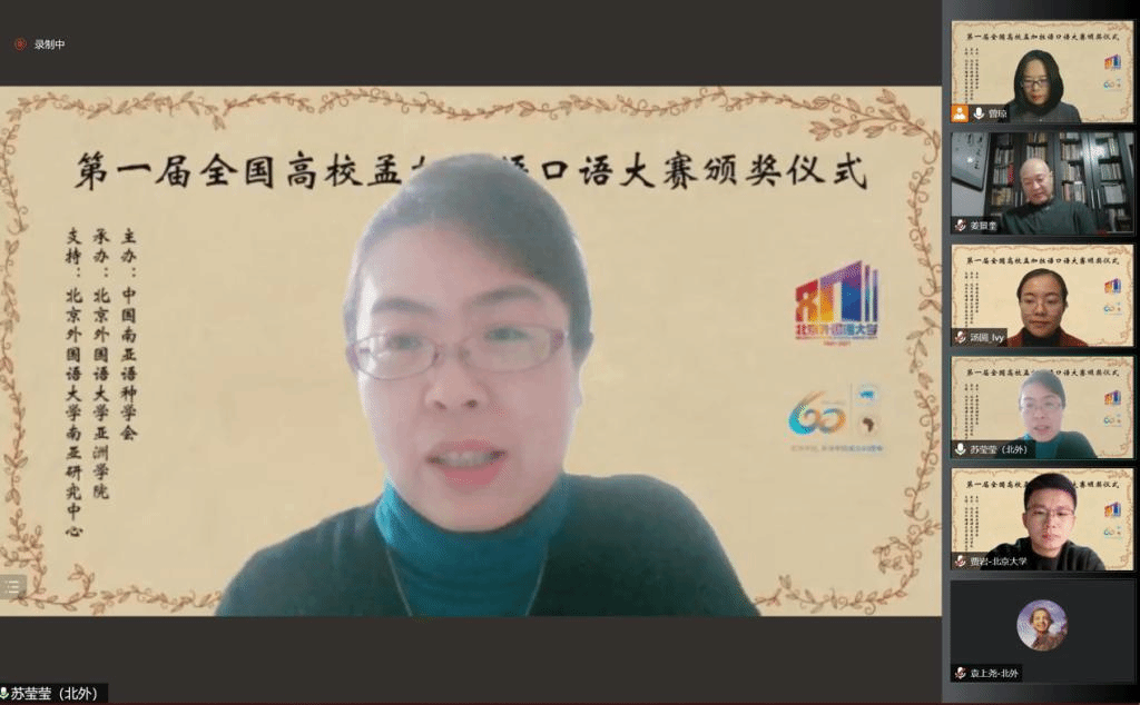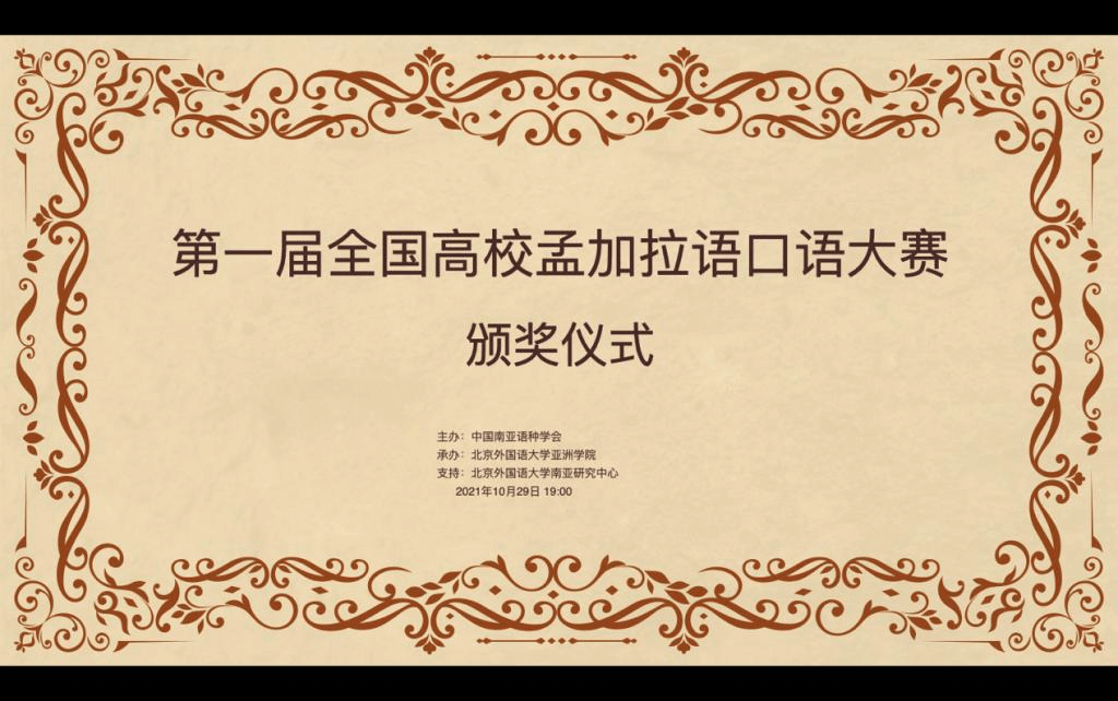 2021年10月29日晚,“第一届全国高校孟加拉语专业口语大赛”颁奖仪式以线上形式举行。孟加拉国驻华大使为发来祝贺视频,中国南亚语种学会会长、教育部高校外指委副主任委员、非通用语分指委主任委员、北京大学南亚研究中心主任姜景奎教授,beat365英国官网院长苏莹莹教授出席仪式并致辞,中央广播电视总台孟加拉语部于广悦主任发来贺词。出席颁奖仪式的还有中国南亚语种学会秘书长、北京大学外国语学院助理教授贾岩博士,beat365英国官网、广东外语外贸大学、云南民族大学、云南大学孟加拉语专业师生共计50余人。颁奖仪式由beat365英国官网孟加拉语教研室主任曾琼教授主持。