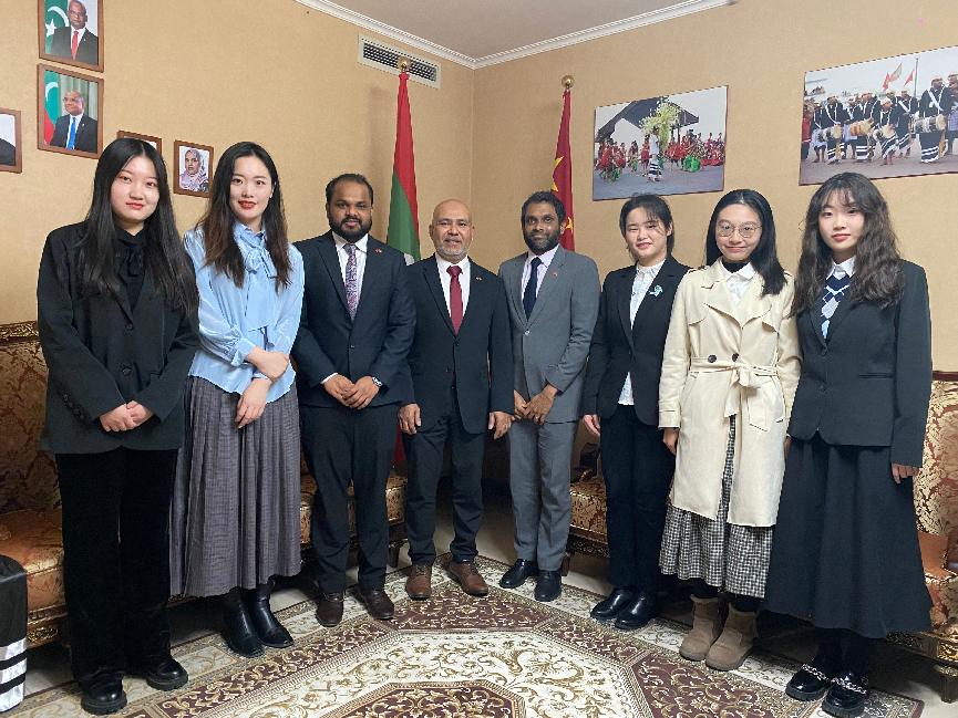 12月9日下午,应马尔代夫驻华大使馆邀请,beat365英国官网迪维希语三外课程师生赴使馆参加马尔代夫迪维希语语言文化交流会、茶话会活动。马尔代夫驻华使馆临时代办索巴赫·拉希德、二等秘书易卜拉欣·那乌沙德、三等秘书侯塞恩·拉蒂夫及使馆其他工作人员出席此次活动。