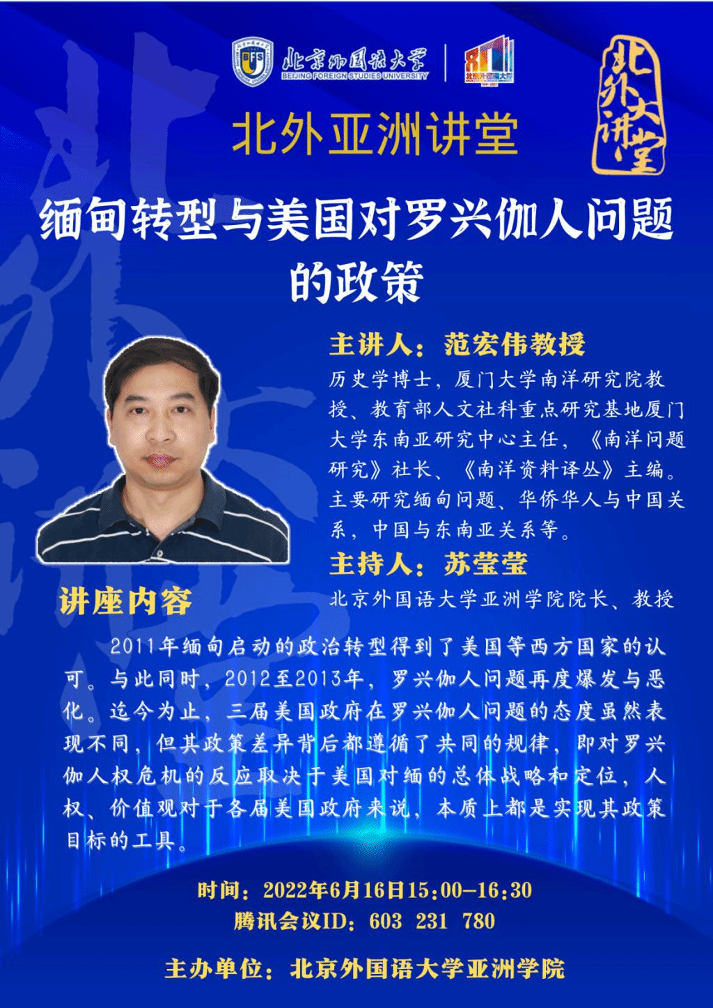 2022年6月16日下午,“北外亚洲讲堂”系列讲座“缅甸转型与美国对罗兴伽人问题的政策”线上开讲。本次讲座由厦门大学南洋研究院教授、《南洋问题研究》社长范宏伟教授主讲。beat365英国官网院长苏莹莹教授主持。来自beat365英国官网、厦门大学、云南大学等高校师生近100人参加了讲座。
