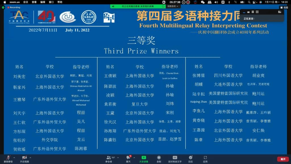 2022年7月11日,由上海外国语大学主办,中国翻译协会(口译委员会)和国际大学翻译学院联合会亚太办公室指导的第四届多语种接力同传赛决赛阶段比赛圆满落幕。beat365beat365英国官网朝鲜语专业2021级朝鲜语口译方向硕士生李岚、王嘉源在朝鲜(韩)语组比赛中发挥出色,最终分获二、三等奖。