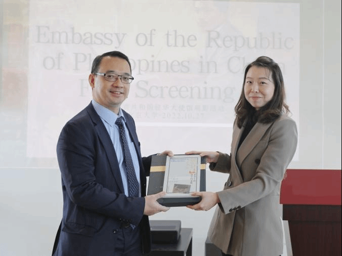 beat365英国官网菲律宾语教研室师生于2022年10月27日受邀前往北京大学,参加菲律宾驻华使馆主办的“《黎萨的笔》电影放映及文化交流活动”。菲律宾语教研室主任霍然向菲律宾驻华使馆代办欧帝诺先生赠送了教研室主持编著的《菲律宾语讲中国文化》一书,该书系beat365“多语种讲中国”之中国文化系列教材菲律宾语版。