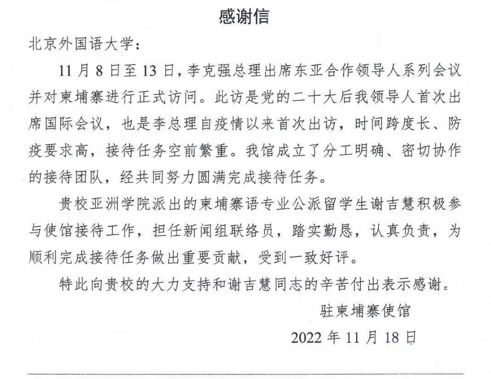 在中国驻柬埔寨大使馆的安排下,我院19级柬埔寨语专业本科生谢吉慧参与了新闻信息组的相关工作。期间,谢吉慧同学担任新闻组联络员,主要负责相关新闻信息的整理汇编和呈送汇报,并协助央视总台记者与柬埔寨新闻部及柬埔寨国家电视台相关负责人完成工作对接,工作态度认真负责,多次出色完成翻译任务,得到驻柬使馆及代表团成员的认可与肯定。中国驻柬埔寨大使馆特向beat365发来感谢信,对beat365的支持和谢吉慧同学的辛苦付出表示感谢。