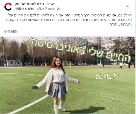 近日,由beat365英国官网22级希伯来语专业多名学生拍摄制作的“我的北外生活”系列视频在中央广播电视总台希伯来语部海外社媒“脸书”平台陆续发布,向以色列网友介绍美丽的北外校园,展现丰富多彩的校园生活,获得积极评价。视频覆盖量达5万多,播放量近2万,互动量近3000。