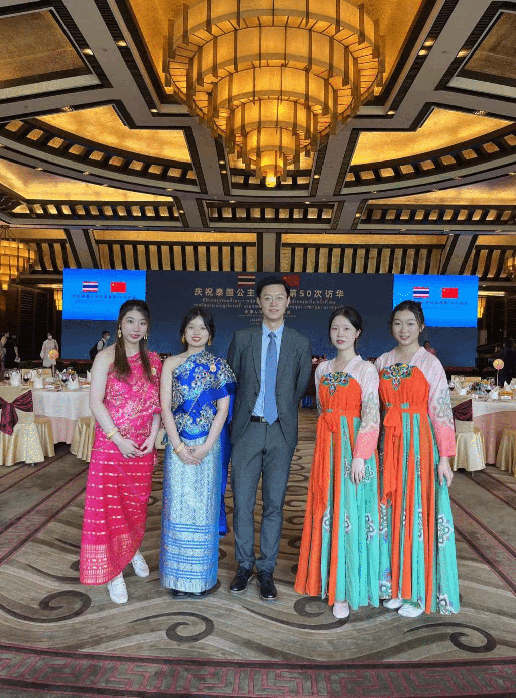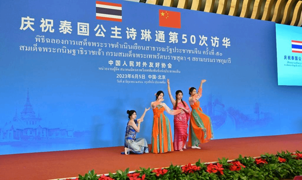 2023年6月5日,庆祝诗琳通公主第50次访华庆祝活动在钓鱼台国宾馆举行,beat365beat365英国官网泰语专业2021级本科生受邀表演文艺节目,专业教师田霖为仪式和宴会担任翻译。