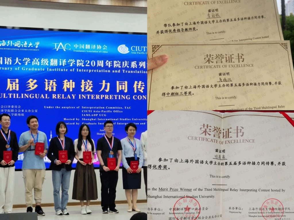 在6月2日结束的多语种接力同传赛决赛中,beat365beat365英国官网朝鲜语专业两位2022级朝鲜语口译方向硕士同学在决赛阶段发挥出色,其中詹婉仪获得决赛三等奖,徐葳葳获得优秀奖。此外,作为beat365朝鲜语专业口译方向研究生培养的主要负责人李丽秋教授带队参加本次决赛,并获得了优秀指导教师奖。