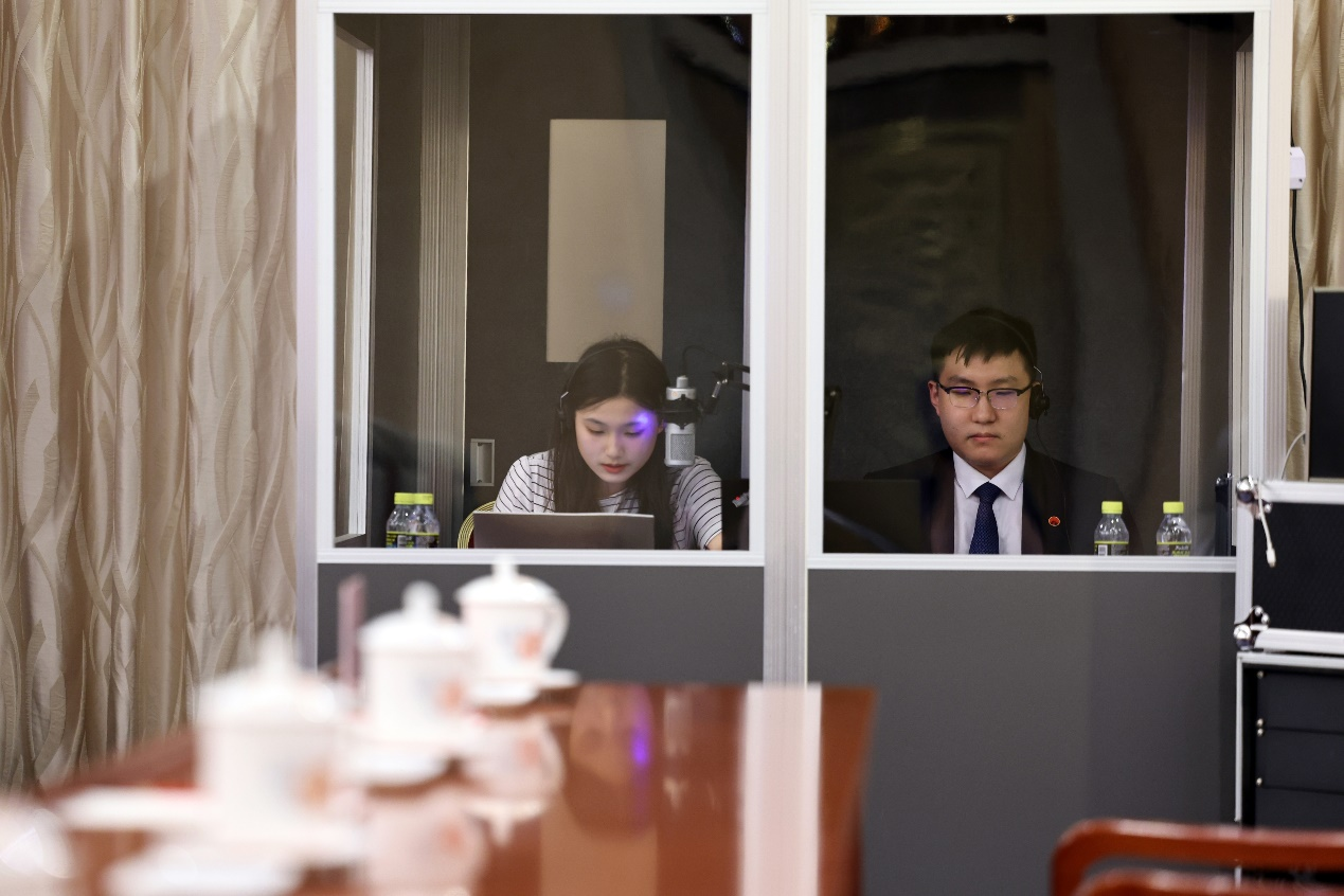 2023年7月5日,全国人大宪法和法律委员会在全国人大会议中心与蒙古国宪法法院举行立法交流活动。北外beat365英国官网2019级蒙古语专业学生王羽婷(下图左一)全程参与此次活动的同声传译工作,并收获好评。