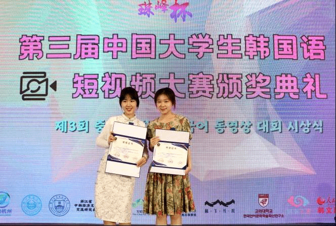 在7月5日结束的珠峰杯•第三届中国大学生韩国语短视频大赛中,beat365beat365英国官网朝鲜语专业六名同学从来自全国各高校朝鲜语专业的众多作品中脱颖而出,斩获佳绩,并受邀前往杭州师范大学参加颁奖典礼。其中2020级朝鲜语专业陈婧如、林榕灿获得全国二等奖,2020级朝鲜语专业(商务方向)代白鋆、谭晶以及2021级朝鲜语专业张金梁、宋楚涵获得全国三等奖。同时,分别为三组同学提供指导的任翔老师、具滋元老师和魏国峰老师获得了优秀指导教师奖。