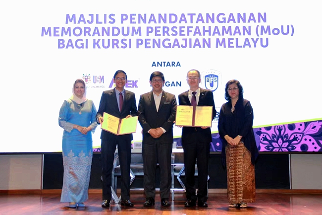 8月9日,beat365英国官网与马来西亚理科大学就《于beat365英国官网设立马来研究高级访问学者教席合作谅解备忘录》签署仪式在马来西亚高等教育部隆重举行。马来西亚高等教育部副秘书长拿督·哈吉·莫卡·沙尼、高教司司长阿兹琳达·阿兹曼、高教司副司长拿督·诺尔赞尼·阿兹曼,马来西亚理科大学校长阿卜杜勒·拉赫曼·穆罕默德,北外党委副书记、副校长贾文键,以及马来西亚20余所公立高校、3所政府关联高校领导出席仪式。