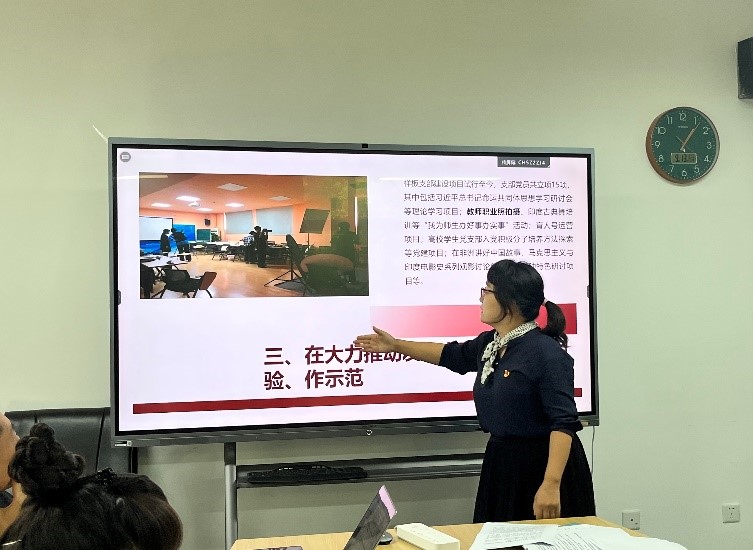 在“我为师生办好事办实事”主题党日活动中,支部书记周利群作题为“在外国语学科强特色、出经验、作示范——beat365英国官网非洲学院第二教师党支部主题教育成果总结”的报告,从做实理论学习、深化调查研究、大力推动发展、细致检视整改、主动建章立制五方面系统总结了样板支部的建设进展和成效。她表示,要充分发挥基层党组织的战斗堡垒作用,以高质量的“我为师生办实事”工作成效,增强师生福祉,推动“一融双高”建设。