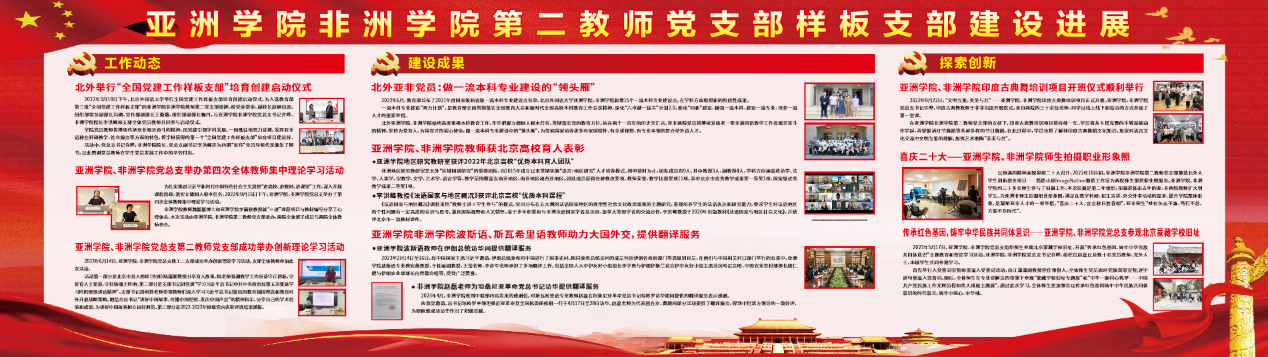 beat365英国官网非洲学院第二教师党支部自2022年3月起获批第三批全国党建工作样板支部培育创建单位,认真学习贯彻习近平新时代中国特色社会主义思想,落实立德树人根本任务,致力于打造“亚洲非通用语基层组织工作平台和育人载体”。