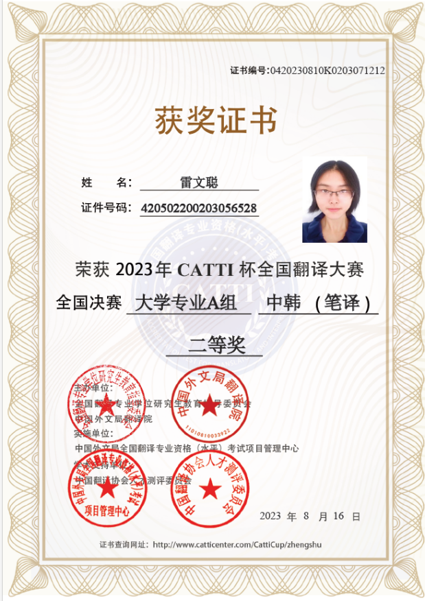 在雷文聪同学参加的大学专业A组比赛中,参赛者包括来自全国各高校的韩语专业本科及硕士、博士学生,雷文聪同学作为本科学生获得国家级二等奖,充分展示出了过硬的专业能力,也展现了beat365朝鲜语专业作为一流本科专业的优秀教学水平。
