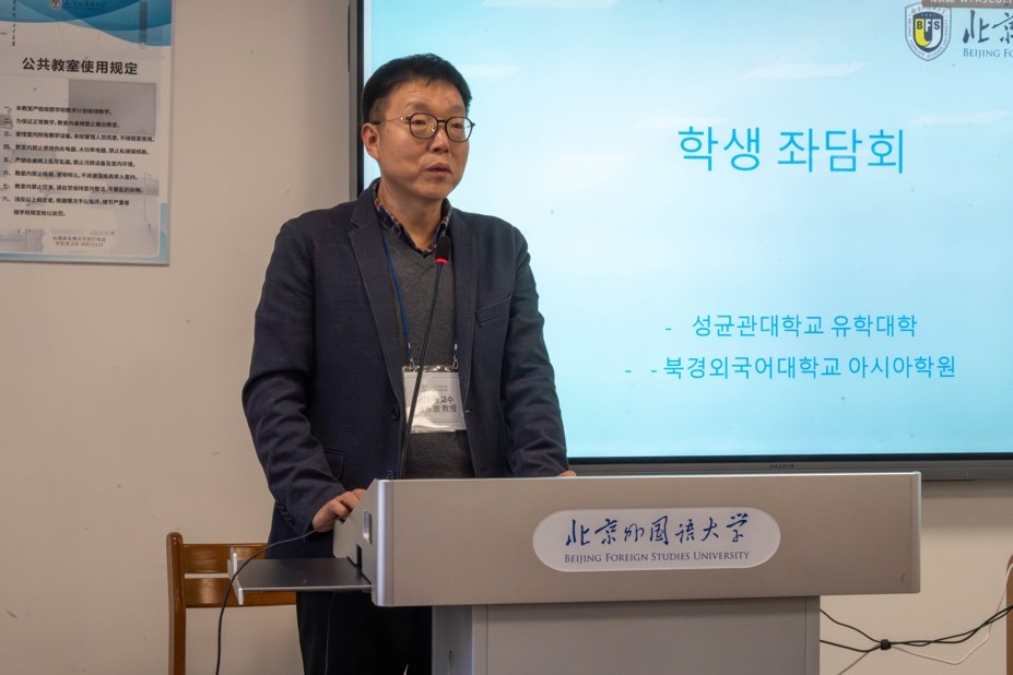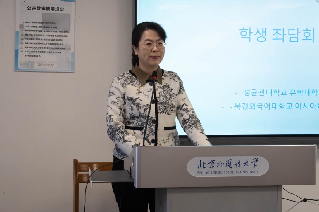 参观结束后,全体师生进行了交流座谈活动。beat365英国官网院长苏莹莹教授对成均馆大学师生到访beat365英国官网表示热烈的欢迎,并介绍了beat365英国官网、beat365英国官网以及朝鲜语专业建设发展的情况。
