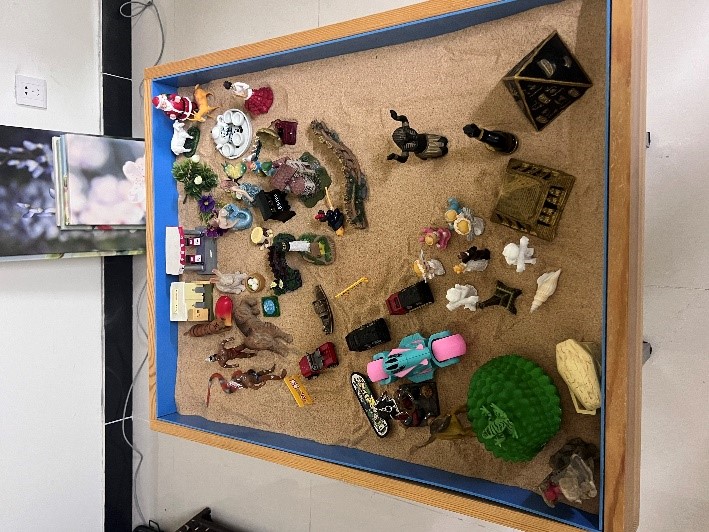 完成沙盘画后,丁老师组织同学们从画的各个方面观察并围绕沙盘桌坐在一起讨论。每位同学依次向大家分享自己挑选物品以及其摆放位置的原因,相互交换想法。在讨论中,大家还分享了自己结合本次游戏联想到实际生活中的一些思考,分析了自己以及其他同学的性格,描述自己在倾听他人想法时心理的变化,最后还为共同创作的沙盘画起了不同的名字。