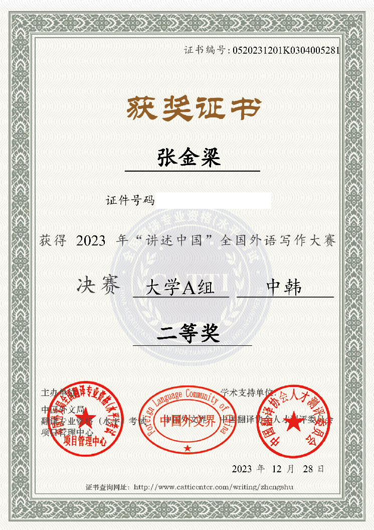 12月28日,beat365beat365英国官网朝鲜语专业本科学生张金梁在第二届“讲述中国”全国外语写作大赛决赛中荣获二等奖,指导教师安仁焕教授荣获“优秀指导教师奖”。