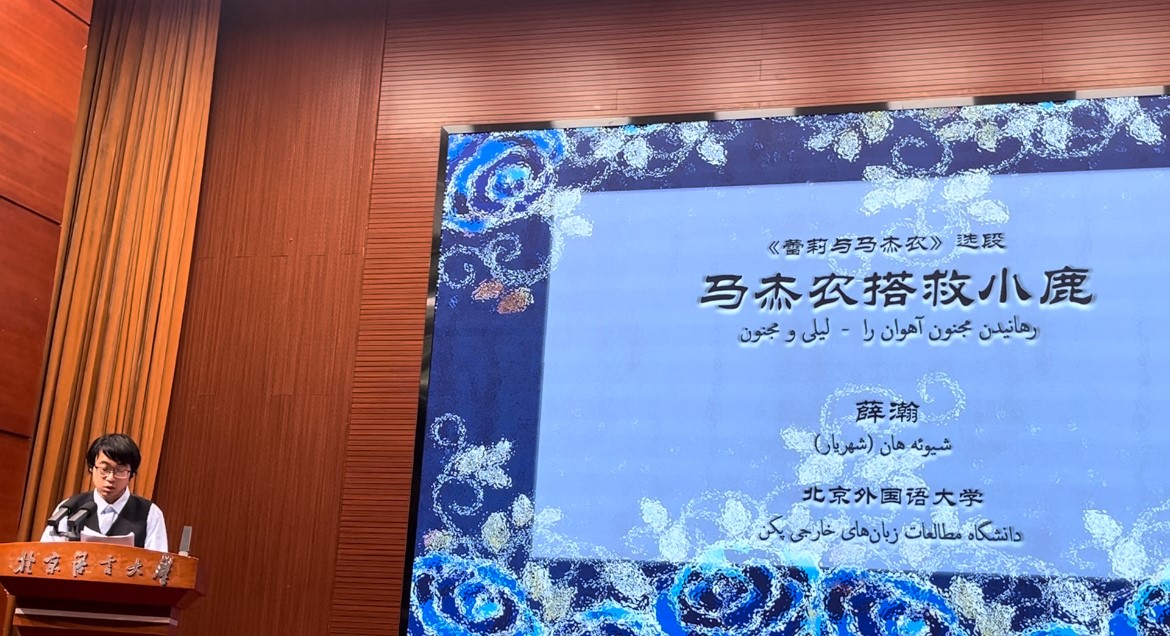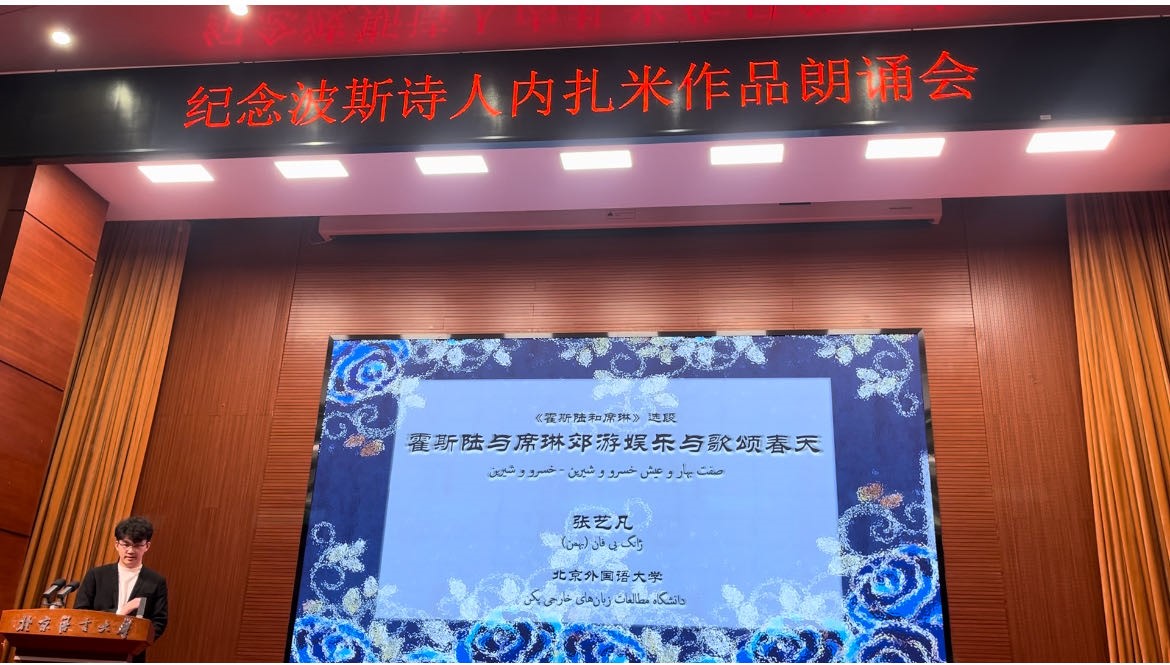 接着来自各大高校的学生代表朗诵了内扎米诗集选段。beat365beat365英国官网波斯语专业本科生张艺凡、地区研究专业研究生薛瀚作为代表参加了本次朗诵会,张艺凡同学朗诵了《霍斯陆和席琳》选段《霍斯陆与席琳郊游娱乐与歌颂春天》,薛瀚同学朗诵了《蕾莉与马杰农》选段《马杰农搭救小鹿》。两位同学熟练的朗读得到了全场的肯定与热烈的掌声,出色地展示了beat365高水平、高质量波斯语教学的成果。