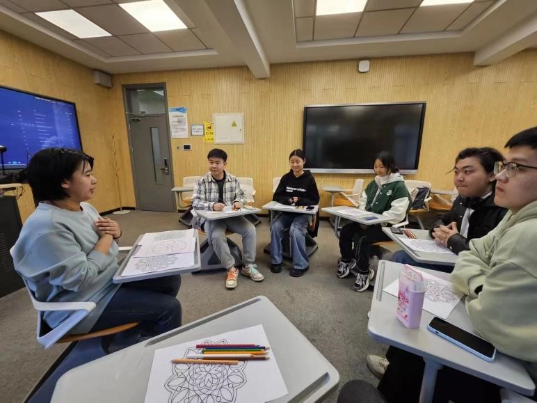 在创作环节,同学们纷纷拿起画笔认真作画、专注于纸间勾勒。展示环节中,同学们依次向大家分享了自己的作品。23级亚美尼亚语的战泉宇同学回忆到小学时学习的“点-线-面”构图法,精细的作品与切身的感悟很快引起了大家的共鸣。之后,各位同学分别就作画时的内心感受和情绪变化相互交流、就学习生活中的心态管理进行了深入探讨,丁老师在每位同学发言后进行针对性点评和心理辅导。