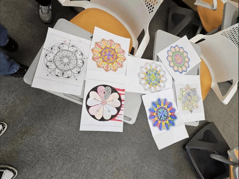 同学们首先依次进行了自我介绍、促进彼此间相互了解,之后选择了曼陀罗绘画图形和画笔、为正式创作做了充足准备。紧接着,丁老师向大家介绍了曼陀罗画的知识背景,在老师的指引下、同学们伴随着悠扬舒缓的音乐进行了5分钟的正念冥想,对自身心理情绪进行了调整。