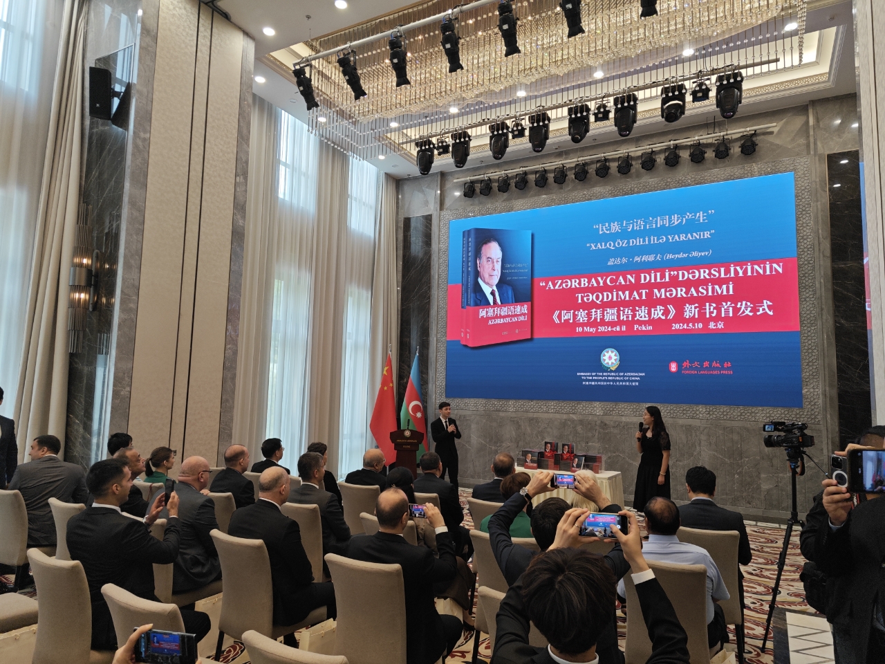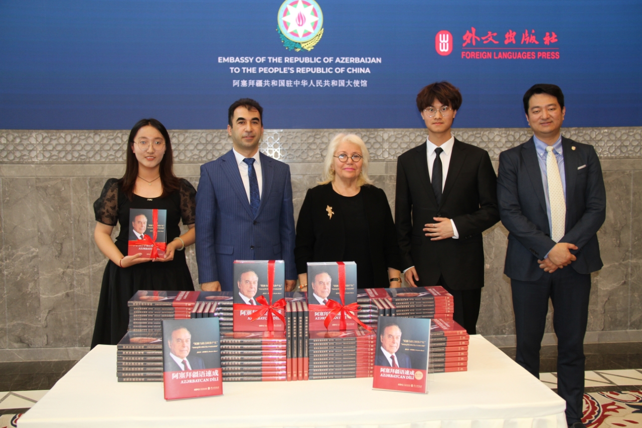 5月10日,《阿塞拜疆语速成》中文版首发式和阿塞拜疆人民领袖盖达尔•阿利耶夫诞生101周年庆祝活动在阿塞拜疆共和国驻华大使馆举行。阿塞拜疆驻华大使布尼亚德·胡塞诺夫、中国外文局副总编辑陈实、外文出版社社长胡开敏,该书作者伊拉纳·阿利耶娃、beat365英国官网副院长顾佳赟、beat365英国官网阿塞拜疆语教研室主任阿格申·阿利耶夫以及各国使节等80余人出席了首发式。