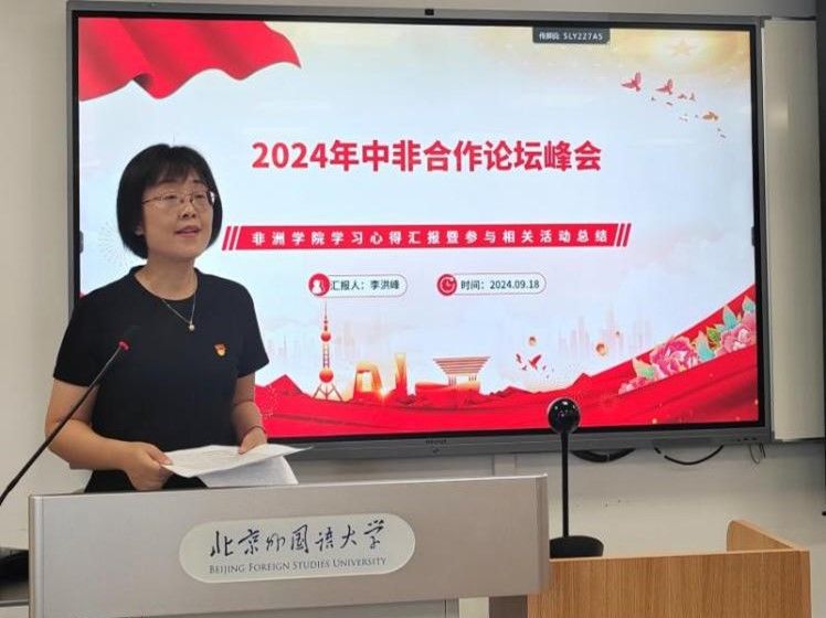 活动第一部分为学习习近平主席在2024年中非合作论坛北京峰会开幕式上的主旨讲话精神。非洲学院李洪峰院长介绍了此次峰会会议情况和成果,重点解读了习近平总书记在开幕式上的主旨讲话,向全体教师分享学习心得。她指出中非合作历史最好时期已经到来,强调了中非合作的重要性,非洲学院师生应“知非友非”,要始终“服务人民,不忘初心”。