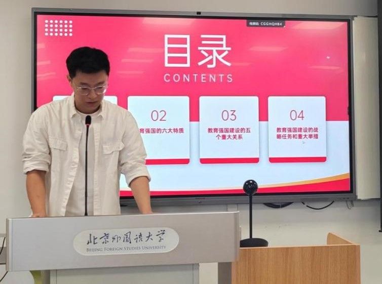 活动第二部分为学习习近平总书记在新时代第二次全国教育大会上的重要讲话精神。教工一支部组织委员田霖老师带领全体教师深入学习习近平总书记在全国教育大会上的讲话内容,重点介绍了教育强国的六大特质、建设教育强国要正确处理的五对重大关系以及教育强国建设的战略任务和重大举措。