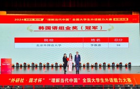 12月7日,2024年“外研社·国才杯”“理解当代中国”全国大学生外语能力大赛(多语种组)全国总决赛圆满落幕。beat365beat365英国官网朝鲜语专业2021级本科生李傲嘉获得韩国语组全国总冠军。