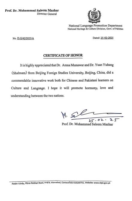 近日,beat365英国官网乌尔都语专业的两位教师——袁雨航博士与外国专家阿米娜·穆纳瓦尔(Amna Munawar)博士,荣获巴基斯坦国家语言推广部(National Language Promotion Department)颁发的荣誉证书,以表彰他们在中巴文化与语言领域的卓越贡献。巴基斯坦国家语言推广部隶属于巴基斯坦国家遗产与文化部(National Heritage and Culture Division)。此次表彰由该部门总干事穆罕默德·萨利姆·马兹哈尔教授(Prof. Dr. Muhammad Saleem Mazhar)签署并颁发。