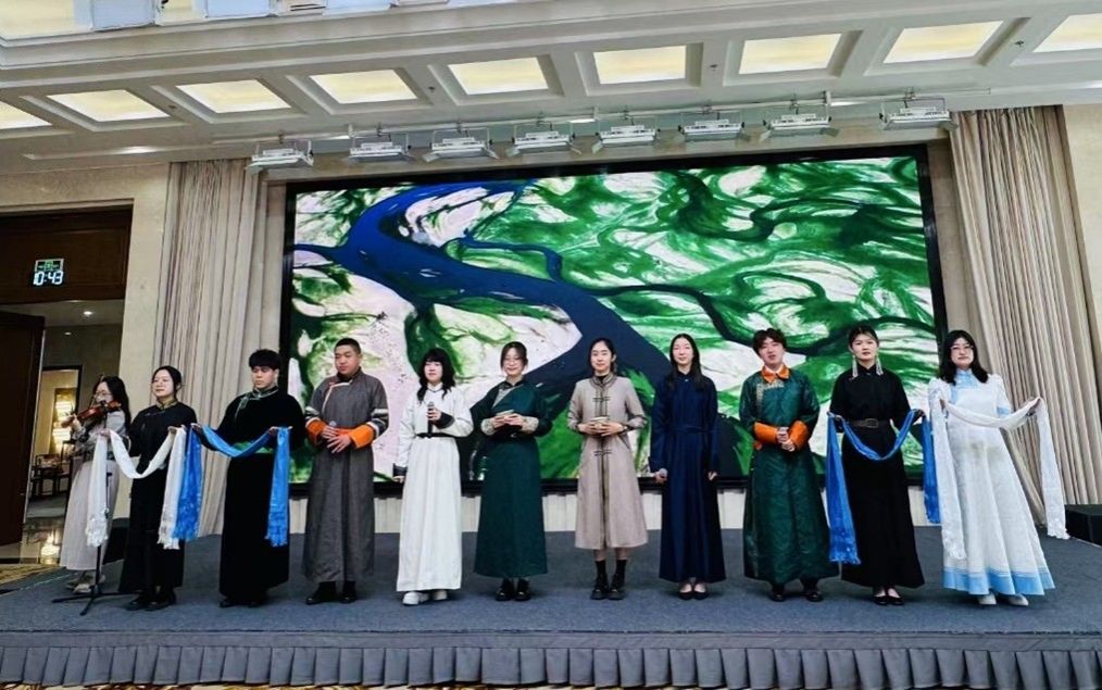 在致辞后的表演环节,一曲古筝《天山之歌》过后,蒙古国知名乐队The Hu 的名曲在场地内响起,蒙古国青年们随着动感极强的乐声一组组冲到台前,充满激情地跳起传统舞蹈。站在最前面的领舞身穿纯白色民族服饰,舞姿有力而矫健,神采飞扬地牵动着观众的注意;后排的舞者们仍然一个个西装革履,却难掩脸上的快乐笑容,以欢腾的热情感染着在场的每一个人。随后,beat3652023级蒙古语本科班同学们以精心排演的歌舞《心中的爱人》作为压轴节目登台亮相。《心中的爱人》是蒙古国电影《戈壁传说》的主题曲,优美动人,余音绕梁。同学们在合唱编排中还精心加入了小提琴伴奏与顶碗舞,视觉与听觉享受交相辉映,相得益彰。蒙古国嘉宾们听了纷纷面露微笑,打起舒缓的节拍,有的还开口轻轻跟唱,深深陶醉其中。表演完毕后,同学们走下舞台将预备好的哈达敬献给与会领导致意。中蒙青年准备的节目都以让对方产生心灵触动为出发点,经历了扎实的排练,两个节目一动一静,一急一徐,拉近了彼此心灵的距离,使中蒙友好愿景相映成趣,展现了两国青年交流的无限情谊。