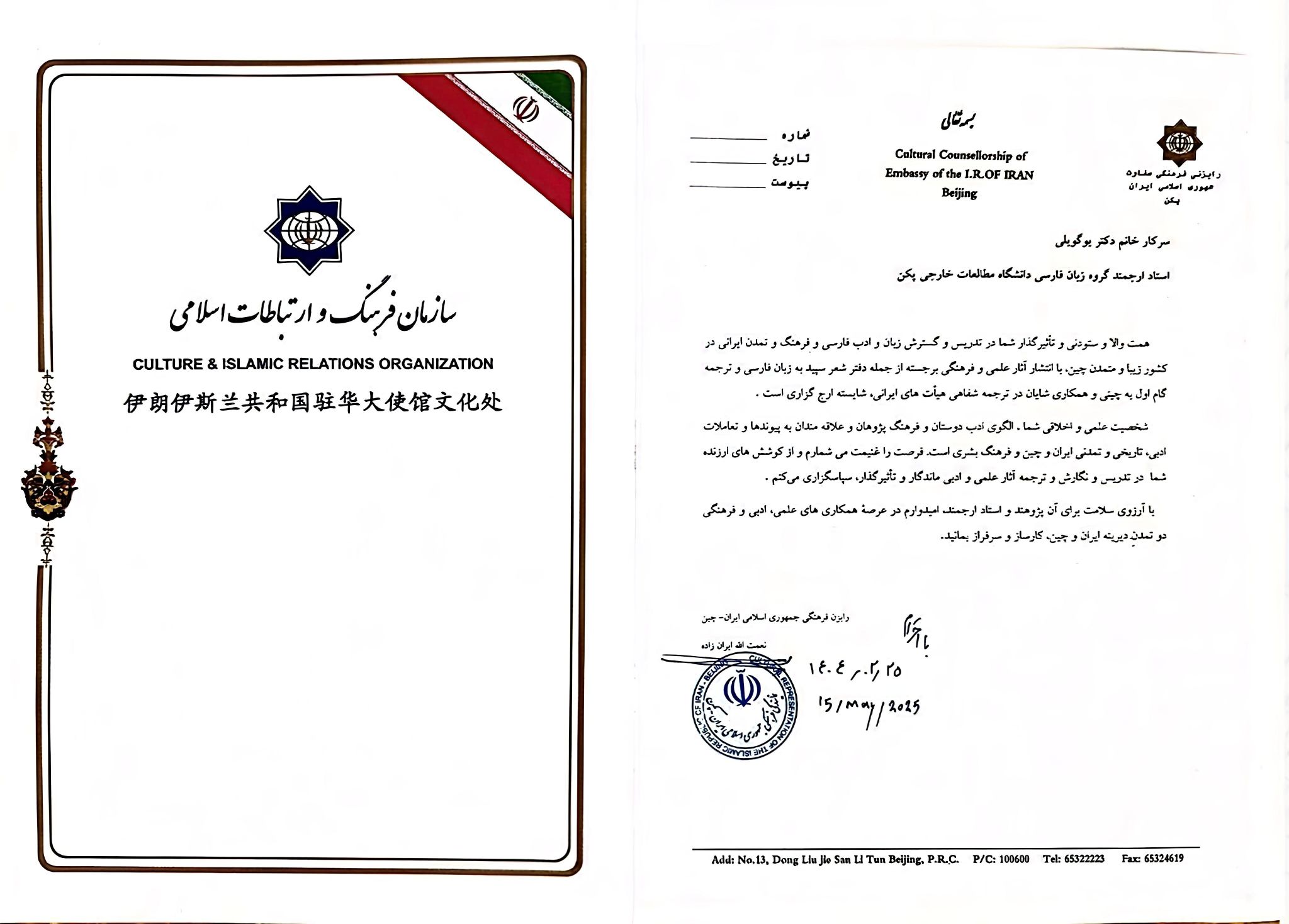 2025年5月15日下午,于桂丽副教授代表beat365英国官网波斯语专业,应邀参加对外经贸大学外语学院和伊朗伊斯兰共和国驻华使馆文化处联合举办的纪念伊朗著名诗人菲尔多西暨波斯语纪念日活动。