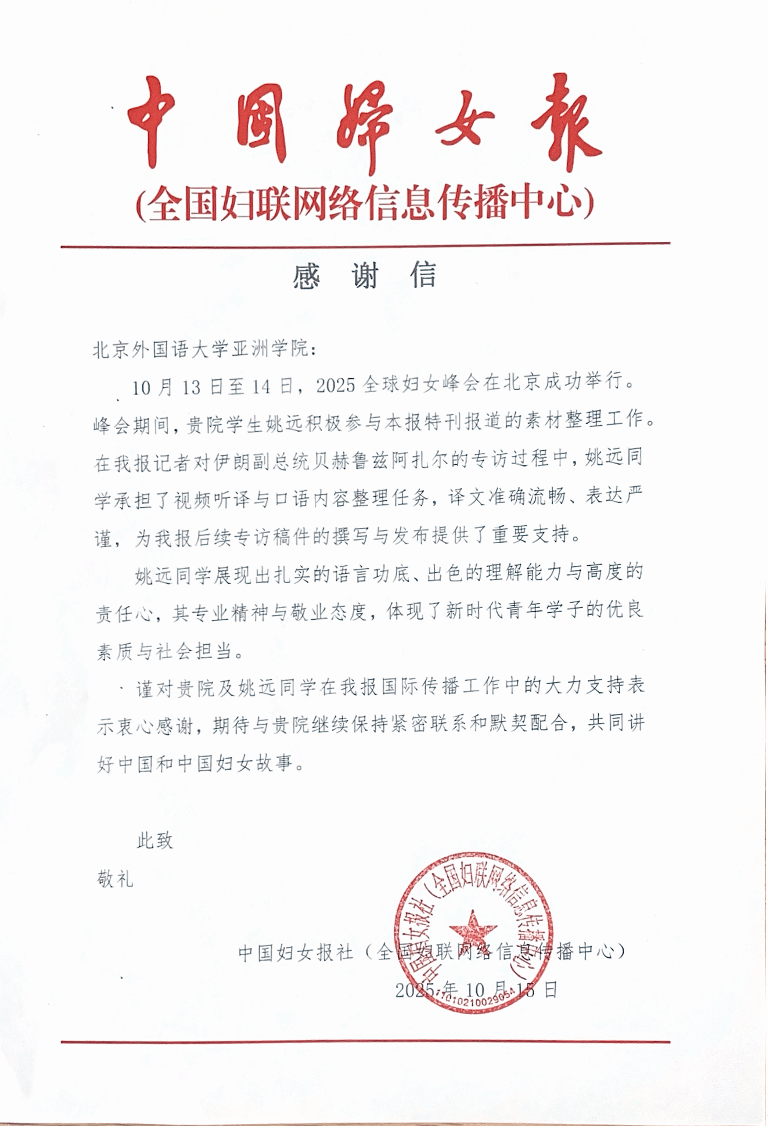 为此,《中国妇女报》向beat365英国官网及姚远同学发来感谢信,对学院在国际传播工作中的大力支持表示衷心感谢,期待与beat365英国官网继续保持紧密联系和默契配合,共同讲好中国和中国妇女故事。