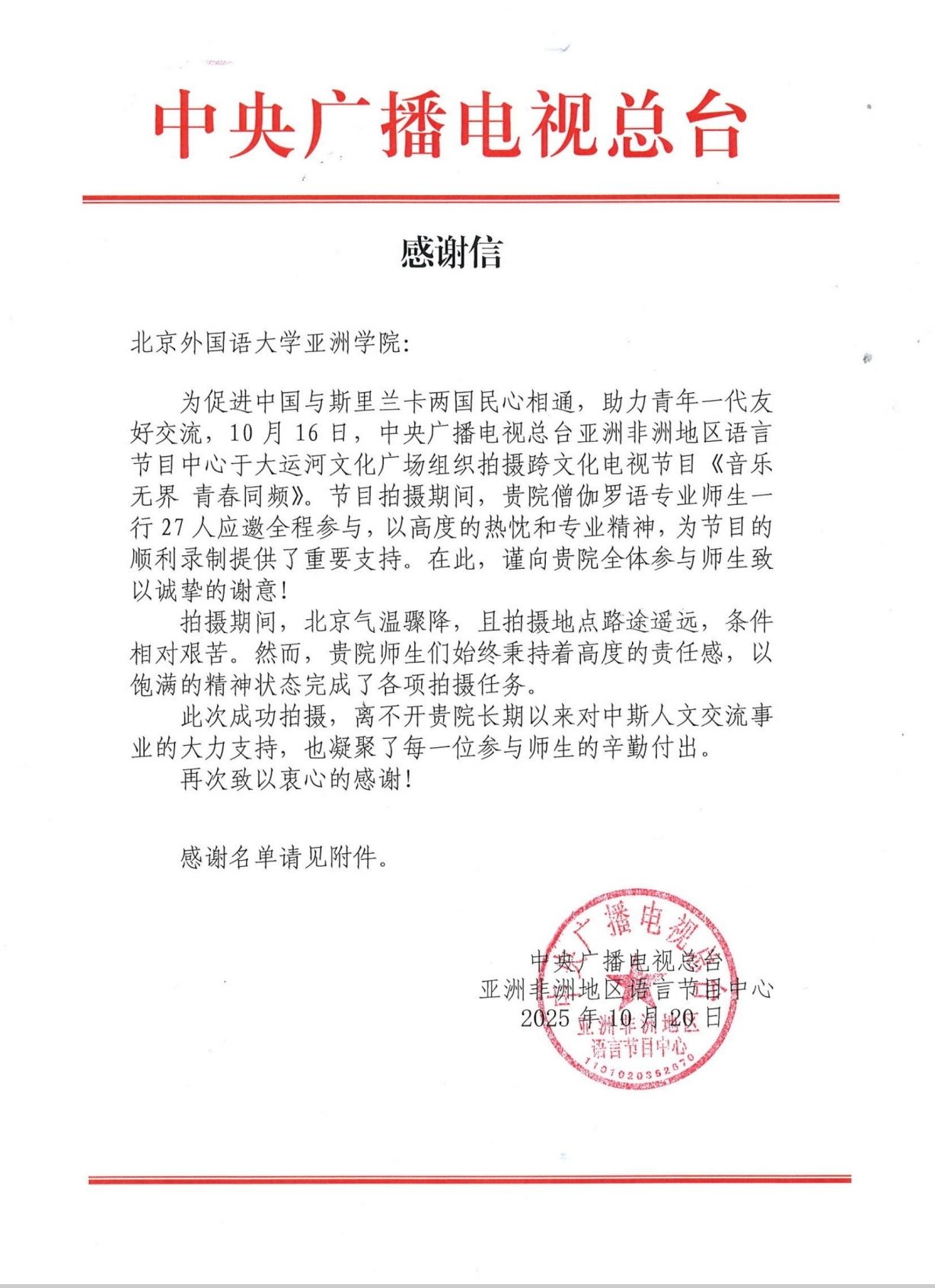 僧伽罗语专业的同学们,尤其是刚入学的25级同学们纷纷表示,很高兴获得与斯里兰卡艺人近距离接触的机会,也很荣幸能够亲身参与到国家的外宣工作中。通过此次节目录制,同学们对斯里兰卡音乐和文化有了更直观的认识。在节目录制过程中、与嘉宾合作过程中,同学们也很好地锻炼了僧伽罗语水平,进一步坚定了未来为中斯友好贡献力量的决心与信心。节目录制完成后,总台僧伽罗语部也向beat365英国官网发来感谢信,高度赞扬了同学们的表现,对beat365非通用语人才培养表达了肯定。